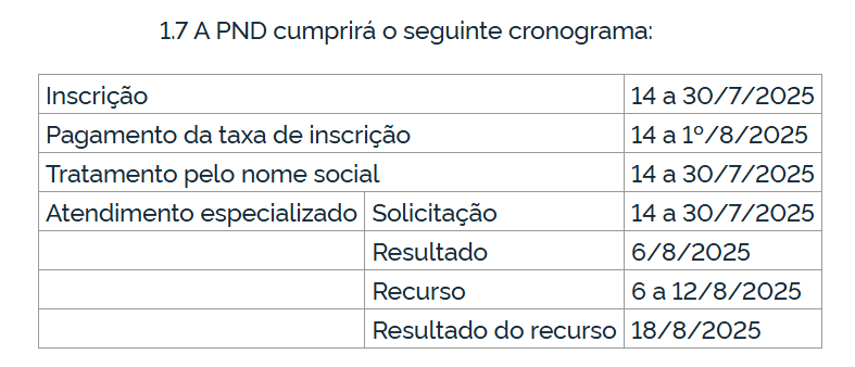 Com essa retificação a inscrição na PND, que deve ser realizada pelo endereço <https://pnd.inep.gov.br/pnd>, se dará entre o dia 14 de julho de 2025 e as 23h59 do dia 30 de julho de 2025, horário de Brasília-DF e passará a obedecer o seguinte calendário: